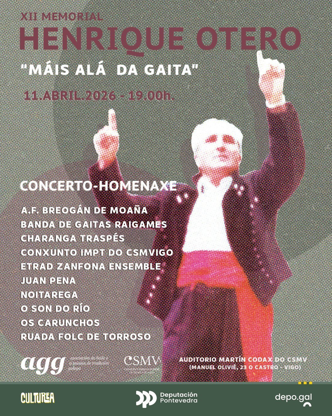 A AGG celebra este ano a XII edición do Memorial Henrique Otero, unha homenaxe-concerto que honra a figura dun dos grandes referentes da música tradicional galega. A cita terá lugar o 11 de abril ás 19:00 h no Auditorio Martín Códax do CSMVigo, con entrada libre ata completar aforo.